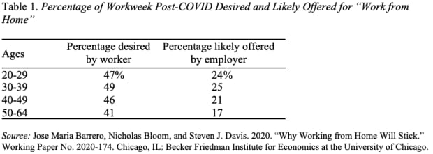 As for going forward, survey participants were asked what percentage of the workweek they would like to work from home and what percentage of the workweek the employer was likely to offer. The respondents desired to work from home about 40% of the time — roughly two days, but thought the employer would offer them about 20% — roughly one day. The preferences of older workers look similar to those of their younger counterparts, as do their views on the flexibility of their employers (see Table 1 below).