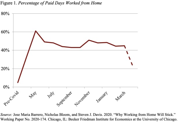 Figure 1 (below) pulls together the findings described. The share of paid days worked from home increased sharply from 5% pre-COVID to 60% during the initial shutdown, declining to 43% in October and projected to level off at roughly 20% — one day out of five — once COVID ends.